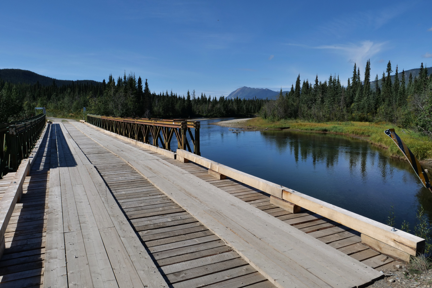 Meine Idee war, in Ross River mit der kleinen Kabelfähre über den Pelly River und dann auf der North Canol Road bis zum Macmillian Pass zu fahren. Die 230 km lange Strasse wird wahrscheinlich in einem schlechteren Zustand sein als der südliche Teil. Vorsichtshalber habe ich Diesel und Wasser getankt. Die Canol Road wurde 1942 gebaut, um eine Pipeline von den Northwest Territories nach Whitehorse zu verlegen. Für die Pipeline wurde eine Hängebrücke über den Pelly River gebaut. Ein Jahr später wurde die Pipeline stillgelegt und abgebaut. Der japanische Angriff auf Alaska blieb aus und die Kosten für das geförderte Öl waren zu hoch. Seit 6 Jahren dient die Hängebrücke als Fussgängerbrücke.