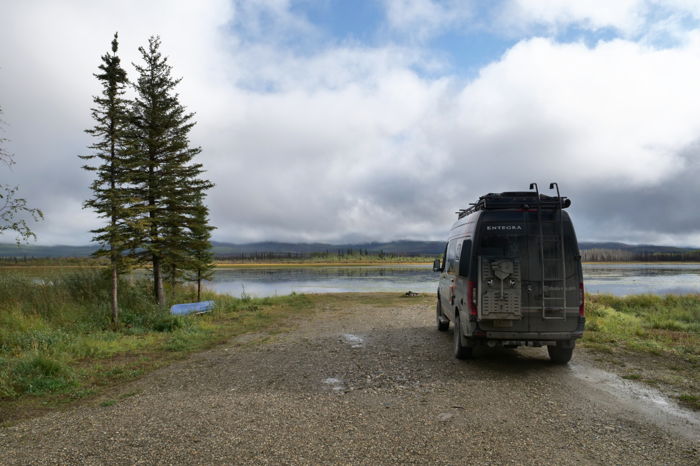Auf dem Rückweg wollte ich an der billigsten Tankstelle in Mayo tanken. Keine meiner Kreditkarten funktionierte. Nach ein paar Minuten Wartezeit kam eine Fehlermeldung. Die nächste Tankstelle ist in Stewart Crossing. Dort das gleiche Problem. Bekam mit ‹contactless› einmal Diesel für 100 CA$. Der Diesel hätte sicher bis Dawson City gereicht. Mit wenig Diesel im Tank funktioniert die Heizung nicht mehr zuverlässig. Bei Nachttemperaturen um die 6°C möchte ich auf die Heizung nicht verzichten. Am Ufer des kleinen Gravel Lake stellte ich den Van für die Nacht ab. Kaum stellte ich den Motor ab, parkten 2 Autos neben mir. Angeln und Picknick wurden ausgepackt. Kaum eine Viertelstunde später war alles wieder schnell eingepackt. Es begann in Strömen zu regnen. Später kam eine junge Familie mit 2 kleinen Kindern aus Colorado an den See. Sie übernachteten in ihrem kleinen Huckepack Pick-up. Es regnete fast die ganze Nacht. Am Morgen verdeckte eine tiefe Wolkendecke die Sicht auf die Berge. Gegen Mittag riss die Wolkendecke stellenweise auf. Blaue Flecken wechselten sich mit verschiedenen Grautönen am Himmel ab.